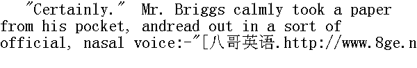 当然。"布里格斯先生镇定自若地从口袋里取出了一个文件,用一种一本正经的鼻音读了起来: