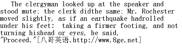 牧师抬头看了一下说话人,默默地站在那里,执事也一样,罗切斯特先生仿佛觉得地震滚过他脚下,稍稍移动了一下,随之便站稳了脚跟,既没有回头,也没有抬眼,便说,"继续下去。"