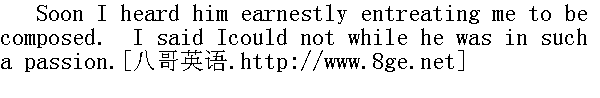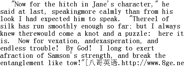 简,我不是一个脾气温和的人--你忘了这点。我忍不了很久。我并不冷静,也不是一个不动感情的人,可怜可怜我和你自己吧,把你的手指按在我脉搏上,感觉一下它怎样跳动吧,而且当心--" He bared his wrist, and offered it to me: the blood was forsakinghis cheek and lips, they were growing livid; I was distressed on allhands. To agitate him thus deeply, by a resistance he so abhorred,was cruel: to yield was out of the question. I did what humanbeings do instinctively when they are driven to utter extremity--looked for aid to one higher than man: the words "God help me!"burst involuntarily from my lips. 他露出手腕,伸向我。他的脸颊和嘴唇因为失血而变得苍白。我左右为难,十分苦恼。用他所厌恶的拒绝把他煽动起来吧,那是残酷的;要让步呢,又不可能。我做了一件走投无路的人出于本能会做的事--求助于高于凡人的神明。"上帝帮助我!"这句话从我嘴里脱口而出。 "I am a fool!" cried Mr. Rochester suddenly. "I keep telling her Iam not married, and do not explain to her why. I forget she knowsnothing of the character of that woman, or of the circumstancesattending my infernal union with her. Oh, I am certain Jane willagree with me in opinion, when she knows all that I know! Just putyour hand in mine, Janet--that I may have the evidence of touch aswell as sight, to prove you are near me--and I will in a few wordsshow you the real state of the case. Can you listen to me" 我真傻:"罗切斯特先生突然说。"我老是告诉她我没有结过婚,却没有解释为什么。我忘了她一点也不知道那个女人的性格,不知道我同她地狱一般结合的背景。呵,我可以肯定,一旦简知道了我所知道的一切,她准会同意我的看法。把你的手放在我的手里,简妮特--这样我有接触和目光为依据,证明你在我旁边--我会用寥寥几句话,告诉你事情的真相。你能听我吗?" "Yes, sir; for hours if you will."" 是的,先生。听你几小时都行。" "I ask only minutes. Jane, did you ever hear or know at I was notthe eldest son of my house: that I had once a brother older thanI?"" 我只要求几分钟。简,你是否听到过,或者知道我在家里不是老大,我还有一个年龄比我大的哥哥?"