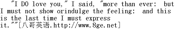我确实爱你,"我说,"从来没有这么爱过。但我决不能表露或纵容这种感情。这是我最后一次表达了。" "The last time, Jane! What! do you think you can live with me, andsee me daily, and yet, if you still love me, be always cold anddistant?"" 最后一次,简!什么!你认为可以跟我住在一起,天天看到我,而同时要是仍爱我,却又经常保持冷漠和疏远吗?" "No, sir; that I am certain I could not; and therefore I see thereis but one way: but you will be furious if I mention it."" 不,先生,我肯定不行,因此我认为只有一个办法,但要是我说出来,你准会发火。" "Oh, mention it! If I storm, you have the art of weeping."" 噢,说吧!我就是大发雷霆,你也有哭哭啼啼的本事。" "Mr. Rochester, I must leave you."" 罗切斯特先生,我得离开你。"