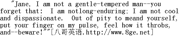 至于简性格上的障碍,"他终于说,比他的神态所让我期望的要镇定。"到现在为止,这团丝线还是转得够顺利的,但我向来知道,会出现结头和迷团,现在就是。此刻面对着烦恼、气怒和无休无止的麻烦!上帝呀!我真想动用参孙的一分力量,快刀斩乱麻!" He recommenced his walk, but soon again stopped, and this time justbefore me. 他又开始走动,但很快停了下来,这回正好停在我面前。 "Jane! will you hear reason?" (he stooped and approached his lips tomy ear); "because, if you won't, I'll try violence." His voice washoarse; his look that of a man who is just about to burst aninsufferable bond and plunge headlong into wild license. I saw thatin another moment, and with one impetus of frenzy more, I should beable to do nothing with him. The present--the passing second oftime--was all I had in which to control and restrain him--a movementof repulsion, flight, fear would have sealed my doom,--and his. ButI was not afraid: not in the least. I felt an inward power; asense of influence, which supported me. The crisis was perilous;but not without its charm: such as the Indian, perhaps, feels whenhe slips over the rapid in his canoe. I took hold of his clenchedhand, loosened the contorted fingers, and said to him, soothingly -" 简!你愿意听我说理吗?(他弯下腰来,凑近我耳朵)因为要是你不听,我就要使用暴力了。"他的声音嘶哑,他的神态像是要冲破不可忍受的束缚,不顾一切地大胆放肆了。我在另一个场合见过这种情形,要是再增一分狂乱的冲动,我就对他无能为力了。此刻,唯有在一瞬之间将他控制住,不然,一个表示厌恶,逃避和胆怯的动作将置我自己一-还有他一一于死地。然而我并不害怕,丝毫没有。我感到一种内在的力量,一种气势在支持着我。危急关头往往险象环生,但也并非没有魅力,就像印第安人乘着皮筏穿过激流所感觉到的那样。我握住他捏得紧紧的手,松开他扭曲的手指,抚慰地对他说: "Sit down; I'll talk to you as long as you like, and hear all youhave to say, whether reasonable or unreasonable."" 坐下吧,你爱谈多久我就同你谈多久,你想说什么,不管有理无理,都听你说。" He sat down: but he did not get leave to speak directly. I hadbeen struggling with tears for some time: I had taken great painsto repress them, because I knew he would not like to see me weep.Now, however, I considered it well to let them flow as freely and aslong as they liked. If the flood annoyed him, so much the better.So I gave way and cried heartily. 他坐了下来,但我并没有让他马上就开口,我己经强忍住眼泪多时,竭力不让它流下来,因为我知道他不喜欢看到我哭。但现在我认为还是让眼泪任意流淌好,爱淌多久就淌多久。要是一腔泪水使他生了气,那就更好。于是我放任自己,哭了个痛快。