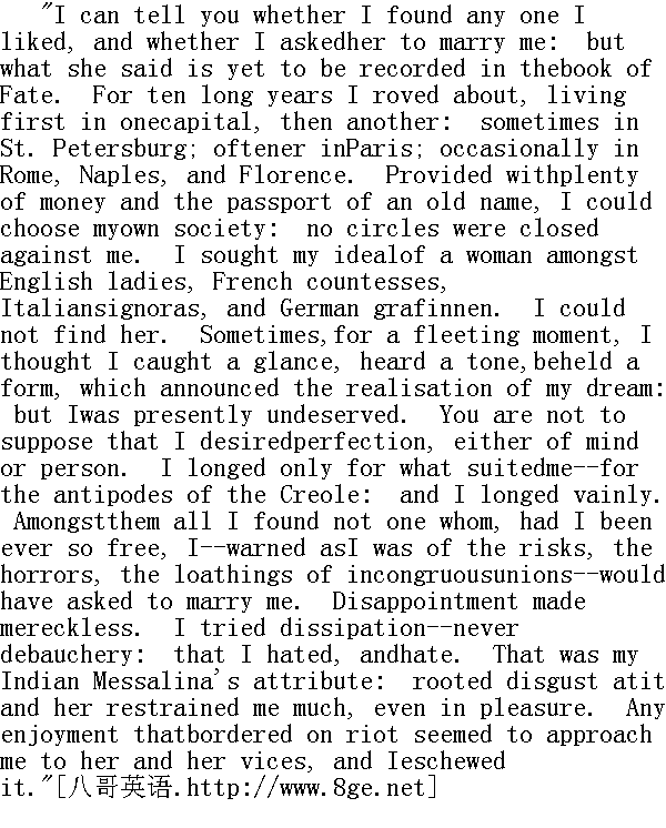 我可以告诉你是否找到了自己喜欢的人,是否向她求婚,但是她所说的话却要记录在'命运'的书本里。十年中我四处飘泊,先住在一个国家的首都,后来又到了另外一个。有时在圣.彼得堡,更多的时候在巴黎,偶尔在罗马、那不勒斯和佛罗伦萨。因为身边有的是钱,又有祖辈的威名作通行证,我可选择自己的社交领域,没有哪个圈子会拒绝我。我寻找着我理想中的女人,在英国的女士中间,法国的伯爵夫人中间,意大利的signoras中间和德国的Grafinner中间。我找不到她。有时刹那之间我以为抓住了一个眼神,听到了一种腔调,看到了一种体形,宣告我的梦想就要实现,但我又马上醒悟了。你别以为我无论在心灵还是人本身上渴求完美,我只是盼望有适合我的人--与克里奥尔人形,成对比,而我徒劳地企望着。即使我完全自由--我常常回想起不和谐的婚姻的危险、可怕和可憎一-在她们所有的人中间,我也找不到一个可以向她求婚的人。失望使我变得轻率起来。我尝试了放荡一-但从来没有纵欲。过去和现在我都厌恶纵欲,那恰是我的那位西印度荡妇的特点,我对她和她的淫荡深恶痛绝,所以即使在作乐时也有所约束。一切近乎淫荡的享受,会使我同她和她的罪恶靠拢,于是我尽力避免。"
