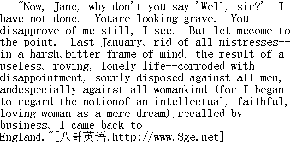 噢,简,你干嘛不说'那么,先生?'我还没有说完呢。你神情严肃,看得出来不同意我的看法。不过让我直说吧。去年一月,我打发走了所有的情妇一-当时的心情既冷酷又苦恼,那是毫无意义、飘忽不定的孤独生活的苦果--我心灰意冷,便怒悻悻地反对一切男性,尤其是反对一切女性(因为,我开始认为理智、忠实、可爱的女人不过是一种梦想),因为事务需要,我回到了英格兰。"