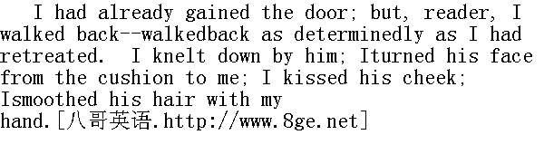 我已经走到了门边,可是读者呀,我走了回来一-像我退出时一样坚决地走了回来。我跪倒在他旁边,我把他的脸从沙发垫转向我,我吻了吻他的脸颊,用手把他的头发撸服贴。