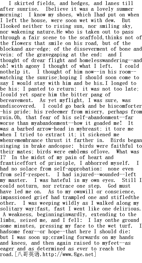 我沿着田野、篱笆和小路走着,直到太阳升起。我想那是个可爱的夏日清晨,我知道离家时穿的鞋子已很快被露水打湿。但我既没看初升的太阳,微笑的天空,也没看苏醒的大自然。被带往断头台,路见漂亮景色的人,不会有心思去想路上朝他微笑的花朵,而只是想到行刑时的木砧和斧头的利刃,想到身首的分离想到最终张着大口的墓穴。我想到了令人丧气的逃跑和无家可归的流浪--呵,想起我离开的一切多么令人痛苦!而我又无可奈何。此刻我想起了他--在他的房间里--看着日出,希望我马上会去说,我愿意与他呆着,愿意属于他。我渴望属于他,渴望回去,现在还不算太晚。我能免除他失我的剧痛。而且可以肯定,我的逃跑还没有被发现。我可以回去,成为他的安慰者--他的骄傲,他的拯救者,免除他的悲苦,也许还有毁灭。呵,我担心他自暴自弃--比我自己的要担心的多--这多么强烈地刺激着我!这是插入我胸膛带倒钩的箭头,我想把它拔出来,它却撕裂着我,而记忆进一步将它往里推去。我疼痛难忍。小鸟在矮树丛和灌木林中开始歌唱。鸟儿忠于它们的伙伴,是爱的标志。而我又是什么呢?在内心的疼痛和狂热地恪守原则之中,我讨厌我自己。我没有从自责中找到安慰,甚至连自尊中也找不到它。我已经损害--伤害--离开了我的主人。在我自个儿眼中我也是可憎的。但我不能回去,甚至后退一步。上帝得继续领我向前。至于我自己的意志或良心,充满激情的忧伤已经把一个扼杀,使另一个窒息。我一面在路上孤独地走着,一面嚎啕大哭,越走越快,就像发了狂。一种虚弱从内心开始扩向四肢,攫住了我,我摔了一交。我在地上躺了一会,把脸埋在潮湿的草地上,我有些担心--或者说是希望--我会死在这儿。但我马上就起来了,先是四脚四手往前爬了一阵,随后再次站了起来--像以往那么急切和坚决地走到了大路上。