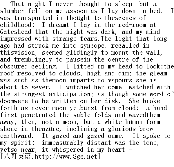 那天晚上我绝没有想到要睡,但我一躺到床上便睡着了。我在想象中又回到了孩提时代的情景。我梦见自己躺在盖茨黑德的红房子里,夜很黑,我的脑子里印着奇奇怪怪的恐惧。很久以前弄得我昏厥的光,又出现在这情景中,似乎溜上了墙,抖动着停在模糊的天花板中间。我抬头去看,只见屋顶已化解成了云彩,又高又暗。那光线像月亮冲破雾气时照在浓雾上的光。我看着月亮过来--带着奇怪的期待注视着,仿佛某种判决词将要刻写在圆圆的脸上。她从云层中冲了出来,从来没有什么月亮像她那么穿云破雾的。一只手伸进了她黑色的皱搁,把它挥走。随后碧空中出现了一个白色的人影,而不是月亮了,那人光芒四射的额头倾向东方,盯着我看了又看,并对我的灵魂说起话来,声音既远在天边,又近在咫尺。它在我耳朵里悄声说: