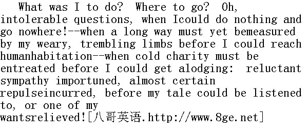 我该怎么办?往哪儿去?呵,当我无法可想,无处可去的时候,那些问题多么难以忍受呀!我得用疲乏颤抖的双腿走完很长的路,才能抵达有人烟的地方--我要恳求发点冷冷的慈悲,才能找到一个投宿之处;我要强求勉为其难的同情,而且多半还会遭人嫌弃,才能使人听听我的经历,满足我的需要。