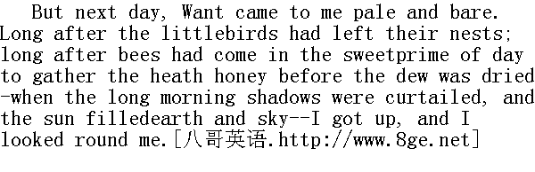 我碰了碰欧石南,只觉得它很干燥,还带着夏日热力的微温。我看了看天空,只见它清明纯净,一颗星星在山凹上空和蔼地眨眼。露水降下来了,带着慈爱的温柔。没有微风在低语。大自然似乎对我很慈祥,虽然我成了流浪者,但我想她很爱我。我从人那儿只能期待怀疑、嫌弃和侮辱,我要忠心耿耿一往情深地依恋大自然。至少今晚我可以在那儿作客了--因为我是她的孩子,我的母亲会收留我,不要钱,不要付出代价。我还有一口吃剩的面包,那面包是我用一便士零钱--我最后的一枚硬币,从下午路过的小镇买来的。我看到了成熟的越桔--像欧石南丛中的煤玉那样,随处闪着光。我采集了一大把,和着面包吃。我刚才还饥肠辘辘,隐士的食品虽然吃不饱,却足以充饥了。吃完饭我做了夜祷告,随后便择榻就寝了。