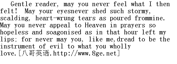 好心的读者呀,但愿你从来没有感受到过我当时的心情!但愿你两眼从没像我那样泪如雨下,淌了那么多灼热揪心的眼泪。愿你从来不必像我当时那么倾吐绝望而痛苦的祈祷,向上天求助。愿你永远不必像我这样担心会给你全身心爱着的人带来灾祸。