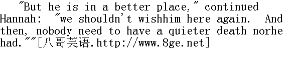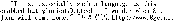是呀,尤其是像德语这样艰涩而出色的语言。不知道圣.约翰什么时候会回家来。" "Surely he will not be long now: it is just ten (looking at alittle gold watch she drew from her girdle). It rains fast, Hannah:will you have the goodness to look at the fire in the parlour?"" 现在肯定不会太久了,才十点呢(她从腰带里掏出一只小小的金表来,看了一眼)"。"雨下得很大,汉娜。请你看一下客厅里的火炉好吗?" The woman rose: she opened a door, through which I dimly saw apassage: soon I heard her stir a fire in an inner room; shepresently came back. 那妇人站起来,开了门。从门外望进去,我依稀看到了一条过道。不一会我听她在内间拨着火,她马上又返回了。 "Ah, childer!" said she, "it fair troubles me to go into yond' roomnow: it looks so lonesome wi' the chair empty and set back in acorner."" 呵,孩子们!"她说,"这会儿进那边的房间真让我难受。椅子空空的,都靠后摆在角落里,看上去很冷清。" She wiped her eyes with her apron: the two girls, grave before,looked sad now. 她用围裙揩了揩眼睛,两位神情严肃的姑娘这时也显得很关心。