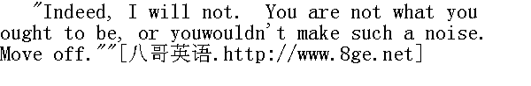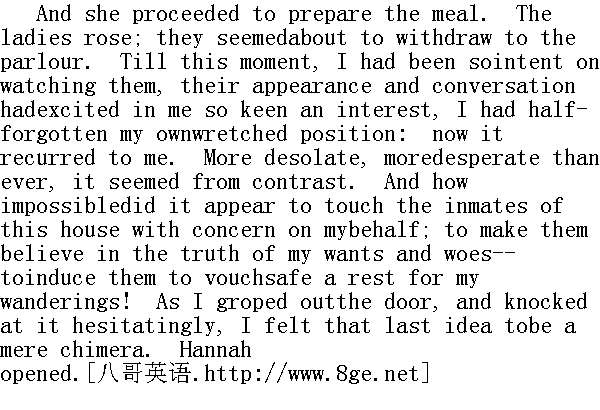 她忙着去准备晚饭了。两位小姐立起身来,似乎正要走开到客厅去。在这之前我一直目不转睛地看着她们,她们的外表和谈话引起了我强烈的兴趣,我竟把自己的痛苦处境忘掉了一半。这会儿却重又想了起来,与她们一对比,我的境遇就更凄凉、更绝望了。要打动房子里的人让她们来关心我,相信我的需要和悲苦是真的一一要说动她们为我的流浪提供一个歇息之处,是多么不可能呀!我摸到门边,犹犹豫豫地敲了起来时,我觉得自己后一个念头不过是妄想。汉娜开了门。 "What do you want?" she inquired, in a voice of surprise, as shesurveyed me by the light of the candle she held." 你有什么事?"她一面借着手中的烛光打量我,一面带着惊异的声调问。 "May I speak to your mistresses?" I said." 我可以同你的小姐们说说吗?"我说。 "You had better tell me what you have to say to them. Where do youcome from?"" 你还是告诉我你有什么话要同她们讲吧,你是从哪儿来的?" "I am a stranger."" 我是个陌生人。"