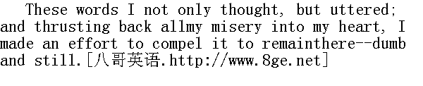 说真的我不让。你不守本份,要不你不会这么吵吵嚷嚷的。走吧!" "But I must die if I am turned away."" 要是把我赶走,我准会死掉的。" "Not you. I'm fear'd you have some ill plans agate, that bring youabout folk's houses at this time o' night. If you've any followers--housebreakers or such like--anywhere near, you may tell them we arenot by ourselves in the house; we have a gentleman, and dogs, andguns." Here the honest but inflexible servant clapped the door toand bolted it within." 你才不会呢。我担心你们打着什么坏主意,所以才那么深更半夜到人家房子里来,要是你有什么同伙一一强入住宅打劫的一类人--就在近旁,你可以告诉他们,房子里不光是我们这几个,我们有一位先生,还有狗和枪。"说到这儿,这位诚实却执拗的佣人关了门,在里面上了闩。 This was the climax. A pang of exquisite suffering--a throe of truedespair--rent and heaved my heart. Worn out, indeed, I was; notanother step could I stir. I sank on the wet doorstep: I groaned--I wrung my hands--I wept in utter anguish. Oh, this spectre ofdeath! Oh, this last hour, approaching in such horror! Alas, thisisolation--this banishment from my kind! Not only the anchor ofhope, but the footing of fortitude was gone--at least for a moment;but the last I soon endeavoured to regain. 这下子可是倒霉透顶了。一阵剧痛--彻底绝望的痛苦一-充溢并撕裂了我的心。其实我已经衰弱不堪,就是再往前跨一步的力气都没有了。我颓然倒在潮湿的门前台阶上。我呻吟着--绞着手--极度痛苦地哭了起来。呵,死亡的幽灵!呵,这最后的一刻来得那么恐怖!哎呀,这种孤独--那么从自己同类中被撵走!不要说希望之锚消失了,就连刚强精神立足的地方也不见了一-至少有一会儿是这样,但后一点,我马上又努力恢复了。 "I can but die," I said, "and I believe in God. Let me try to waitHis will in silence."" 我只能死了,"我说,"而我相信上帝,让我试着默默地等待他的意志吧。"