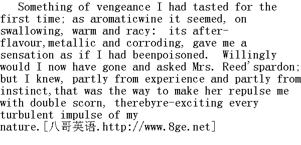 我第一次尝到了复仇的滋味。犹如芬芳的美酒,喝下时热辣辣好受,但回味起来却又苦又涩,给人有中了毒的感觉。此刻,我很乐意去求得里德太太的宽恕,但经验和直觉告诉我,那只会使她以加倍的蔑视讨厌我,因而会重又激起我天性中不安份的冲动。