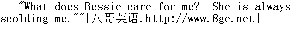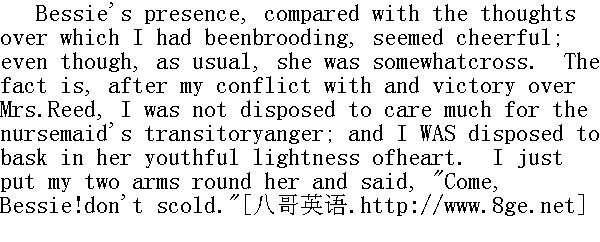 比之刚才萦回脑际的念头,贝茜的到来似乎是令人愉快的,尽管她照例又有些生气。其实,同里德太太发生冲突。并占了上风之后,我并不太在乎保姆一时的火气,倒是希望分享她那充满活力、轻松愉快的心情。我只是用胳膊抱住了她,说:"得啦,贝茜别骂我了。"