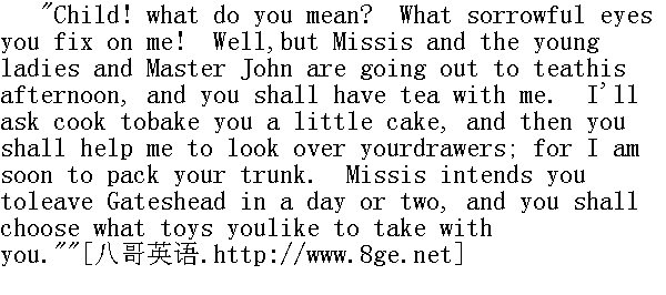 孩子!你这是什么意思?你盯着我的那双眼睛多么忧郁!瞧!太太、小姐和约翰少爷今天下午都出去用茶点了,你可以跟我一起吃茶点。我会叫厨师给你烘一个小饼,随后你要帮我检查一下你抽屉,因为我马上就要为你整理箱子了。太太想让你一两天内离开盖茨黑德,你可以拣你喜欢的玩具随身带走。"