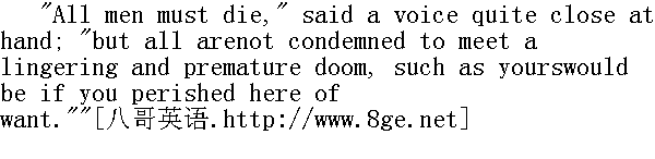 人总是要死的,"离我很近的一个声音说道:"但并不是所有的人都注定要象你这样,慢悠悠受尽折磨而早死的,要是你就这么死于饥渴的话。" "Who or what speaks?" I asked, terrified at the unexpected sound,and incapable now of deriving from any occurrence a hope of aid. Aform was near--what form, the pitch-dark night and my enfeebledvision prevented me from distinguishing. With a loud long knock,the new-comer appealed to the door." 是谁,或者什么东西在说话?"我问道,一时被突如其来的声音吓了一跳。此刻我不会对发生的任何事情寄予得救的希望。一个影子移近了一-究竟什么影子,漆黑的夜和衰弱的视力使我难以分辨。这位新来者在门上重重地长时间敲了起来。 "Is it you, Mr. St. John?" cried Hannah." 是你吗,圣.约翰先生?"汉娜叫道。 "Yes--yes; open quickly."" 是呀-一是呀,快开门。" "Well, how wet and cold you must be, such a wild night as it is!Come in--your sisters are quite uneasy about you, and I believethere are bad folks about. There has been a beggar-woman--I declareshe is not gone yet!--laid down there. Get up! for shame! Moveoff, I say!"" 哎呀,那么个狂风暴雨的夜晚,你准是又湿又感觉冷了:进来吧--你妹妹们为你很担心,而且我相信附近有坏人。有一个女讨饭--我说她还没有走呢?躺在那里。快起来!真害臊!我说你走吧!"