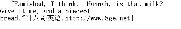 我想是饿坏了。汉娜,那可是牛奶,给我吧,再给一片面包。" Diana (I knew her by the long curls which I saw drooping between meand the fire as she bent over me) broke some bread, dipped it inmilk, and put it to my lips. Her face was near mine: I saw therewas pity in it, and I felt sympathy in her hurried breathing. Inher simple words, too, the same balm-like emotion spoke: "Try toeat." 黛安娜(我是在她朝我弯下身子,看到垂在我与火炉之间的长卷发知道的)掰下了一些面包,在牛奶里浸了一浸,送进我嘴里。她的脸紧挨着我,在她脸上我看到了一种怜悯的表情,从她急促的呼吸中我感受到了她的同情。她用朴素的话说出了满腔温情:"硬吃一点吧。" "Yes--try," repeated Mary gently; and Mary's hand removed my soddenbonnet and lifted my head. I tasted what they offered me: feeblyat first, eagerly soon." 是呀--硬吃一点"玛丽和气地重复着,从我头上摘去了湿透的草帽,把我的头托起来。我尝了尝他们给我的东西,先是恹恹地,但马上便急不可耐了。 "Not too much at first--restrain her," said the brother; "she hashad enough." And he withdrew the cup of milk and the plate ofbread." 先别让她吃得太多一一控制一下,"哥哥说,"她已经吃够了"。于是她端走了那杯牛奶和那盘面包。 "A little more, St. John--look at the avidity in her eyes."" 再让她吃一点点吧,圣.约翰--瞧她眼睛里的贪婪相。"