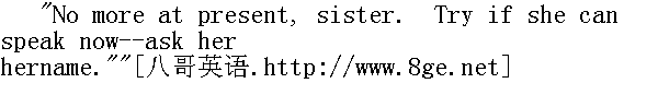 暂时不要了,妹妹。要是她现在能说话,那就试着--问问她的名字吧。" I felt I could speak, and I answered--"My name is Jane Elliott."Anxious as ever to avoid discovery, I had before resolved to assumean ALIAS. 我觉得自己能说了,而且回答--'我的名字叫简.爱略特,因为仍急于避免被人发现,我早就决定用别名了。 "And where do you live? Where are your friends?"" 你住在什么地方,你的朋友在哪里," I was silent. 我没有吭声。 "Can we send for any one you know?"" 我们可以把你认识的人去叫来吗?"