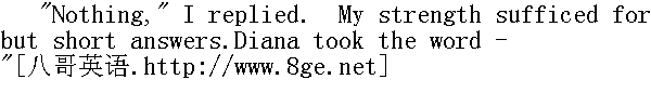 没有,"我回答。我的力气只够我作这样简要的回答。黛安娜接过了话: "Do you mean," she asked, "that we have now given you what aid yourequire? and that we may dismiss you to the moor and the rainynight?"" 你的意思是,"她问,"我们既然已给了你所需要的帮助,那就可以把你打发到荒原和雨夜中去了?" I looked at her. She had, I thought, a remarkable countenance,instinct both with power and goodness. I took sudden courage.Answering her compassionate gate with a smile, I said--"I will trustyou. If I were a masterless and stray dog, I know that you wouldnot turn me from your hearth to-night: as it is, I really have nofear. Do with me and for me as you like; but excuse me from muchdiscourse--my breath is short--I feel a spasm when I speak." Allthree surveyed me, and all three were silent. 我看了看她。我想她的脸很出众,流溢着力量和善意。我蓦地鼓起勇气,对她满是同情的目光报之以微笑。我说:"我会相信你们。假如我是一条迷路的无主狗,我知道你们今天晚上不会把我从火炉旁撵走。其实,我真的并不害怕。随你们怎么对待我照应我吧,但请原谅我不能讲得太多--我的气很短--一讲话就痉挛。"三个人都仔细打量我,三个人都不说话。 "Hannah," said Mr. St. John, at last, "let her sit there at present,and ask her no questions; in ten minutes more, give her theremainder of that milk and bread. Mary and Diana, let us go intothe parlour and talk the matter over."" 汉娜,"圣.约翰先生终于说,"这会儿就让她坐在那里吧,别问她问题。十分钟后把剩下的牛奶和面包给她。玛丽和黛安娜,我们到客厅去,仔细谈谈这件事吧。" They withdrew. Very soon one of the ladies returned--I could nottell which. A kind of pleasant stupor was stealing over me as I satby the genial fire. In an undertone she gave some directions toHannah. Ere long, with the servant's aid, I contrived to mount astaircase; my dripping clothes were removed; soon a warm, dry bedreceived me. I thanked God--experienced amidst unutterableexhaustion a glow of grateful joy--and slept. 他们出去了。很快一位小姐回来了一-我分不出是哪一位,我坐在暖融融的火炉边时,一种神思恍惚的快感悄悄地流遍我全身。她低声吩咐了汉娜。没有多久,在佣人的帮助下,我挣扎着登上楼梯,脱去了湿淋淋的衣服,很快躺倒在一张温暖干燥的床上。我感谢上帝--在难以言说的疲惫中感受到了一丝感激的喜悦--便睡着了。