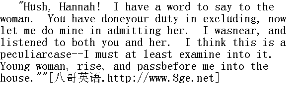 嘘,汉娜!我来对这女人说句话,你已经尽了责把她关在门外,这会儿让我来尽我的责把她放进来。我就在旁边,听了你也听了她说的。我想这情况特殊一一我至少得了解一下。年轻的女人,起来吧,从我面前进屋去。" With difficulty I obeyed him. Presently I stood within that clean,bright kitchen--on the very hearth--trembling, sickening; consciousof an aspect in the last degree ghastly, wild, and weather-beaten.The two ladies, their brother, Mr. St. John, the old servant, wereall gazing at me. 我困难地照他的话办了,不久我就站在干净明亮的厨房里了--就在炉子跟前--浑身发抖,病得厉害,知道自己风吹雨打、精神狂乱,样子极其可怕。两位小姐,她们的哥哥圣.约翰先生和老仆人都呆呆地看着我。 "St. John, who is it?" I heard one ask." 圣.约翰,这是谁呀,"我听见一个问。 "I cannot tell: I found her at the door," was the reply." 我说不上来,发现她在门边,"那人回答。 "She does look white," said Hannah." 她脸色真苍白,"汉娜说。