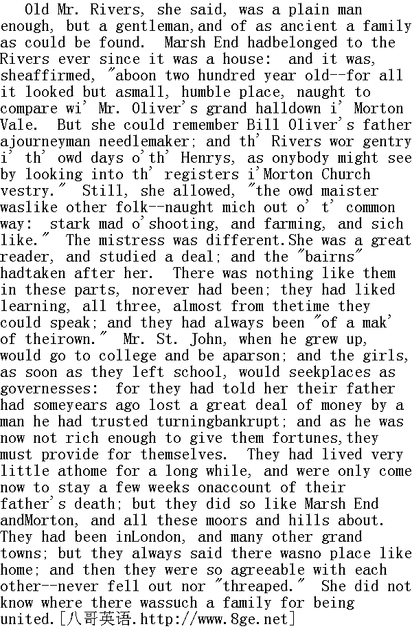 她说老里弗斯先生是个极为朴实的人,但是位绅士,出身于一个十分古老的家庭。沼泽居自建成以后就一直属于里弗斯先生,她还肯定,这座房子"已有两百年左右历史了--尽管它看上去不过是个不起眼的小地方,丝毫比不上奥利弗先生在莫尔顿谷的豪华富宅,但我还记得比尔.奥利弗的父亲是个走家穿户的制针人,而里弗斯家族在过去亨利时代都是贵族,看看莫尔顿教堂法衣室记事簿,就谁都知道。"不过她仍认为"老主人像别人一样--并没有太出格,只是完全迷恋于狩猎种田等等。"女主人可不同。她爱读书,而且学得很多。"孩子们"像她。这一带没有人跟他们一样的,以往也没有。三个人都喜欢学习,差不多从能说话的时候起就这样了,他们自己一直"另有一套"。圣.约翰先生长大了就进大学,做起牧师来、而姑娘们一离开学校就去找家庭教师的活,他们告诉她,他们的父亲,几年前由于信托人破产,而丧失了一大笔钱。他现在已不富裕,没法给他们财产,他们就得自谋生计了。好久以来他们已很少住在家里了,这会儿是因为父亲去世才来这里小住几周的。不过他们确实也喜欢沼泽居和莫尔顿,以及附近所有的荒原和小山。他们到过伦敦和其他很多大城市,但总是说什么地方也比不上家里。另外,他们彼此又是那么融洽一-从来不争不吵。她不知道哪里还找得到这样一个和睦的家庭。