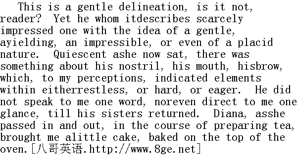 这是一幅线条柔和的写生,是不是,读者?然而画中的人给人的印象却并不属于那种温和忍让、容易打动甚至十分平静的个性。虽然他此刻默默地坐着,但我觉察到,他的鼻孔、嘴巴、额头有着某种东西,表现出内心的不安、冷酷或急切。他的妹妹们回来之前、他还没有同我说过一个字,或者朝我看过一眼。黛安娜走进走出,准备着茶点,给我带来了一块在炉顶上烤着的小饼。