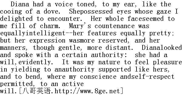 黛安娜的声调在我听来象鸽子的咕咕声。她有一双我很乐意接触她目光的眼睛。她的整张脸似乎都充满魅力。玛丽的面容,一样聪明-一她的五官一样漂亮,但她的表情更加冷淡,她的仪态虽然文雅却更显得隔膜。黛安娜的神态和说话的样子都有一种权威派头,显然很有主意。我生性喜欢服从像她那样有依靠的权威,在我的良心和自尊允许范围内,向富有活力的意志低头。