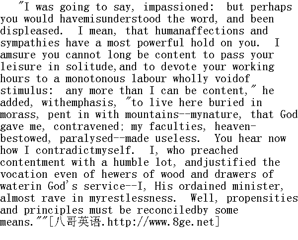 我正要说多情,但也许你会误解这个字,而会不高兴。我的意思是,人类的爱心和同情心在你的身上表现得很强烈。我确信你不会长期满足于在孤寂中度过闲暇,把你的工作时间用于一项完全没有刺激的单调劳动,"他又强调着补充说,"就象我不会满足于住在这里,埋没在沼泽地里,封闭在大山之中-一上帝赐予我的天性与此格格不入,上天所赋予的才能会被断送--会弄得.一无用处。这会儿你听见了我如何自相矛盾了吧。我自己讲道时说要安于自己卑贱的命运,只要为上帝效劳,即使当砍柴工和汲水人也心甘情愿一一而我,上帝所任命的牧师,几乎是焦躁不安地咆哮着。哎呀,爱好与原则总得想个办法统一起来。"