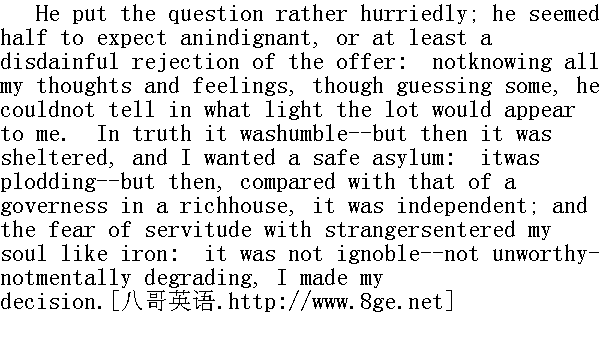 他的问题问得有些匆忙。他似乎估计这个建议多半会遭到愤怒的,或者至少轻蔑的拒绝。他虽然可以作些猜测,但不完全了解我的思想和感情,无法判断我会怎样看待自己的命运。说实在,这工作很低下--但提供了住所,而我需要一个安全的避难所。这工作沉闷乏味-一但比之富人家庭的女教师,它却是无拘无束的。而替陌生人操劳的恐惧象铁钳一样夹住了我的心。这个工作并不丢脸--不是不值得一一精神上也并不低下,我下定了决心。