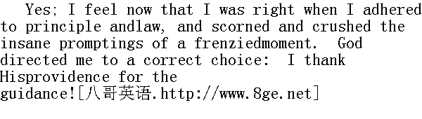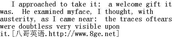 走过去收了下来,这是一件值得欢迎的礼品。我走近他时,我想他用严厉的目光审视着我。毫无疑问,我脸上明显有泪痕。 "Have you found your first day's work harder than you expected?" heasked." 你发觉第一天的工作比你预料的要难吗?"他问。 "Oh, no! On the contrary, I think in time I shall get on with myscholars very well."" 呵,没有!相反,我想到时候我会跟学生们处得很好。" "But perhaps your accommodations--your cottage--your furniture--havedisappointed your expectations? They are, in truth, scanty enough;but--" I interrupted -" 可是也许你的居住条件--你的房子--你的家具一-使你大失所望?说真的是够寒碜的,不过--"我打断了他: "My cottage is clean and weather-proof; my furniture sufficient andcommodious. All I see has made me thankful, not despondent. I amnot absolutely such a fool and sensualist as to regret the absenceof a carpet, a sofa, and silver plate; besides, five weeks ago I hadnothing--I was an outcast, a beggar, a vagrant; now I haveacquaintance, a home, a business. I wonder at the goodness of God;the generosity of my friends; the bounty of my lot. I do notrepine."" 我的小屋很干净,也经得住风雨。我的家具很充足,使用起来也方便。我所看到的只能使我感到幸运,而不是沮丧。我绝不是这样一个傻瓜和享乐主义者,居然对缺少地毯、沙发、银盘而懊悔不已。更何况五周前我一无所有--我当时是一个弃儿、一个乞丐、一个流浪者。现在我有了熟人,有了家,有了工作。我惊异于上帝的仁慈,朋友的慷慨,命运的恩惠。我并不感到烦恼。"
