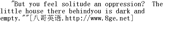 是的,我现在感到,自己坚持原则和法规,蔑视和控制狂乱时刻缺乏理智的冲动是对的。上帝指引我作了正确的选择,我感谢上苍的指导! Having brought my eventide musings to this point, I rose, went to mydoor, and looked at the sunset of the harvest-day, and at the quietfields before my cottage, which, with the school, was distant half amile from the village. The birds were singing their last strains - 薄暮时分,我想到这里便站了起来,走向门边,看看收获日子的夕阳,看看小屋前面静悄悄的田野,田野与学校离村庄有半英里。鸟儿们正唱着它们最后的一曲。 "The air was mild, the dew was balm."" 微风和煦,露水芬芳。" While I looked, I thought myself happy, and was surprised to findmyself ere long weeping--and why? For the doom which had reft mefrom adhesion to my master: for him I was no more to see; for thedesperate grief and fatal fury--consequences of my departure--whichmight now, perhaps, be dragging him from the path of right, too farto leave hope of ultimate restoration thither. At this thought, Iturned my face aside from the lovely sky of eve and lonely vale ofMorton--I say LONELY, for in that bend of it visible to me there wasno building apparent save the church and the parsonage, half-hid intrees, and, quite at the extremity, the roof of Vale Hall, where therich Mr. Oliver and his daughter lived. I hid my eyes, and leant myhead against the stone frame of my door; but soon a slight noisenear the wicket which shut in my tiny garden from the meadow beyondit made me look up. A dog--old Carlo, Mr. Rivers' pointer, as I sawin a moment--was pushing the gate with his nose, and St. Johnhimself leant upon it with folded arms; his brow knit, his gaze,grave almost to displeasure, fixed on me. I asked him to come in. 这么瞧着感到很愉快,而且惊异地发觉自己不久哭起来了--为什么?因为厄运硬是把两情依依的我与主人拆开;因为我再也见不到他了;因为绝望的忧伤和极度的愤怒一一我离开的后果--这些也许正拉着他远远离开正道,失去了最后改邪归正的希望。一想到这里我从黄昏可爱的天空和莫尔顿孤独的溪谷转过脸来--我说孤独,那是因为在山弯里,除了掩映在树从中的教堂和牧师住宅,以及另一头顶端住着有钱的奥利弗先生和他的女儿的溪谷庄园,再也看不见其他建筑了。我蒙住眼睛,把头靠在房子的石门框上。但不久那扇把我的小花园与外边草地分开的小门附近,传来了轻轻的响动,我便抬起头来。一条狗--不一会儿我看到是里弗斯先生的猎狗卡罗一-正用鼻子推着门。圣.约翰自己抱臂靠在门上,他双眉紧锁,严肃得近乎不快的目光盯着我,我把他请进了屋。 "No, I cannot stay; I have only brought you a little parcel mysisters left for you. I think it contains a colour-box, pencils,and paper."" 不,我不能久呆,我不过给你捎来了一个小包裹,是我妹妹们留给你的。我想里面有一个颜色盒,一些铅笔和纸张。"