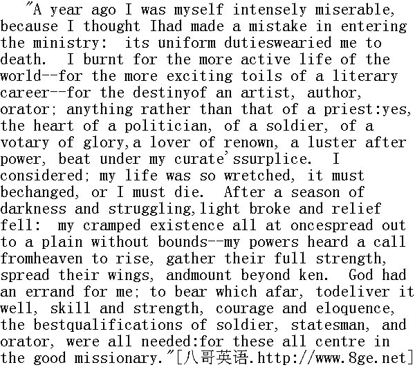 一年之前,我也极其痛苦,觉得当牧师是一大错误。它千篇一律的职责乏味得要死。我热烈向往世间更活跃的生活-一向往文学经历更激动人心的劳作一-向往艺术家、作家、演说家的命运,只要不当牧师,随便当什么都可以。是的,一个政治家、一个士兵、一个光荣事业的献身者、一个沽名钓誉者、一个权力欲很强的人的一颗心,在牧师的法衣下跳动。我认为我的生活是悲惨的,必须加以改变,否则我得死去。经过一段黑暗和挣扎的时期,光明到来,宽慰降临。我那原先狭窄的生活,突然间扩展到一望无垠的平原-一我的能力听到了上天的召唤,起来,全力以赴,张开翅膀,任意飞翔。上帝赐予我一项使命,要做到底做得好,技巧和力量、勇气和雄辩等士兵、政治家、演说家的最好质都是必不可少的,因为一个出色的传教士都集这些于一身。 "A missionary I resolved to be. From that moment my state of mindchanged; the fetters dissolved and dropped from every faculty,leaving nothing of bondage but its galling soreness--which time onlycan heal. My father, indeed, imposed the determination, but sincehis death, I have not a legitimate obstacle to contend with; someaffairs settled, a successor for Morton provided, an entanglement ortwo of the feelings broken through or cut asunder--a last conflictwith human weakness, in which I know I shall overcome, because Ihave vowed that I WILL overcome--and I leave Europe for the East."" 我决心当个传教士。从那一刻起我的心态起了变化,镣铐熔化了,纷纷脱离我的官能,留下的不是羁绊而是擦伤的疼痛-一那只有时间才能治愈。其实我父亲反对我的决定,但自他去世以后,我已没有合法的障碍需要排除。一些事务已经妥善处理,莫尔顿的后继者也已经找到。一两桩感情纠葛已经冲破或者割断--这是与人类弱点的最后斗争,我知道我能克服,因为我发誓我一定要克服它--我离开欧洲去东方。" He said this, in his peculiar, subdued, yet emphatic voice; looking,when he had ceased speaking, not at me, but at the setting sun, atwhich I looked too. Both he and I had our backs towards the pathleading up the field to the wicket. We had heard no step on thatgrass-grown track; the water running in the vale was the one lullingsound of the hour and scene; we might well then start when a gayvoice, sweet as a silver bell, exclaimed - 他说这话的时候用的是奇怪、克制却又强调的口吻。说完了抬起头来,不是看我,而是看着落日,我也看了起来。他和我都背朝着从田野通向小门的小径。在杂草丛生的小径上,我们没有听到脚步声,此时此刻此情此景中,唯一让人陶醉的声音是潺潺的溪流声。因此当一个银铃似的欢快甜蜜的嗓音叫起来时,我们很吃了一惊: "Good evening, Mr. Rivers. And good evening, old Carlo. Your dogis quicker to recognise his friends than you are, sir; he prickedhis ears and wagged his tail when I was at the bottom of the field,and you have your back towards me now."" 晚上好,里弗斯先生,晚上好,老卡罗。你的狗比你先认出了你的朋友来呢,我还在底下田野上,他已经竖起耳朵,摇起尾巴来了,而你到现在还把背向着我。"