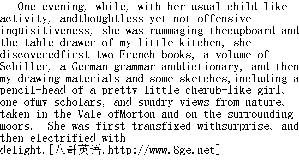 一天晚上,她照例像孩子一样好动,粗心却并不冒犯地问这问那,一面翻着我小厨房里的碗橱和桌子的抽屉。她看到了两本法文书,一卷席勒的作品,一本德文语法和词典。随后又看到了我的绘画材料,几张速写,其中包括用铅笔画的一个小天使般的小姑娘、我的一个学生的头像和取自莫尔顿溪谷及周围荒原的不同自然景色。她先是惊讶得发呆,随后是高兴得激动不已。