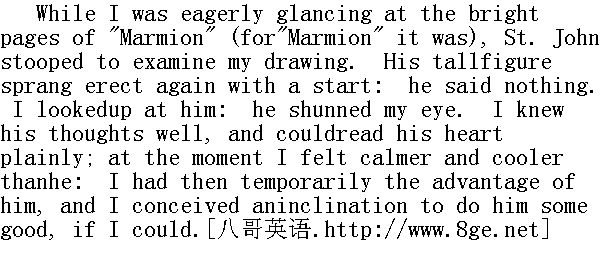 我急不可耐地浏览着《玛米昂》辉煌的篇章(因为《玛米昂》确实如此)时,圣.约翰俯身细看起我的画来。他蓦地惊跳起来,拉直了高高的身子。他什么也没有说,我抬头看他,他避开了我的目光,我很明白他的想法,能直截了当地看出他的心思来。这时候我觉得比他镇定和冷静。随后我暂时占了优势,产生了在可能情况下帮他做些好事的想法。