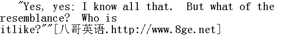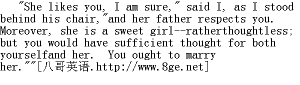 这时他偷偷地抬起眼来。他犹犹豫豫忐忑不安地看了我一眼,再次细看起这幅画来。 "That I should like to have it is certain: whether it would bejudicious or wise is another question."" 我是肯定要的,不过这样做是不是审慎或明智,那就是另外一回事了。" Since I had ascertained that Rosamond really preferred him, and thather father was not likely to oppose the match, I--less exalted in myviews than St. John--had been strongly disposed in my own heart toadvocate their union. It seemed to me that, should he become thepossessor of Mr. Oliver's large fortune, he might do as much goodwith it as if he went and laid his genius out to wither, and hisstrength to waste, under a tropical sun. With this persuasion I nowanswered - 既然我已弄明白罗莎蒙德真的喜欢他,她的父亲也不大可能反对这门亲事,我--我对自己的观点并不像圣.约翰那样得意扬扬--我心里完全倾向于主张他们的结合。我觉得要是他能获得奥利弗先生的大宗财产,他可以用这笔钱做很多事情,强似在热带的太阳下让才能枯竭,让力气白费。想着可以这么劝说他,我此刻回答说: "As far as I can see, it would be wiser and more judicious if youwere to take to yourself the original at once."" 依我看来,立刻把画中的本人要走,倒是更明智和更有识见的。" By this time he had sat down: he had laid the picture on the tablebefore him, and with his brow supported on both hands, hung fondlyover it. I discerned he was now neither angry nor shocked at myaudacity. I saw even that to be thus frankly addressed on a subjecthe had deemed unapproachable--to hear it thus freely handled--wasbeginning to be felt by him as a new pleasure--an unhoped-forrelief. Reserved people often really need the frank discussion oftheir sentiments and griefs more than the expansive. The sternest-seeming stoic is human after all; and to "burst" with boldness andgood-will into "the silent sea" of their souls is often to confer onthem the first of obligations. 这时候他已坐了下来,把画放在面前的桌子上,双手支撑着额头,多情地反复看着这张画。我发觉他对我的大胆放肆既不发火也不感到震惊。我甚至还看到,那么坦率地谈论一个他认为不可接触的话题--听这个话题任意处理--开始被他感到是一种新的乐趣--一种出乎意外的宽慰。沉默寡言的人常常要比性格爽朗的人更需要直率地讨论他们的感情和不幸,看似最严酷的禁欲主义者毕竟也是人。大胆和好心"闯入"他们灵魂的"沉寂大海",常常等于是赋予他们最好的恩惠。