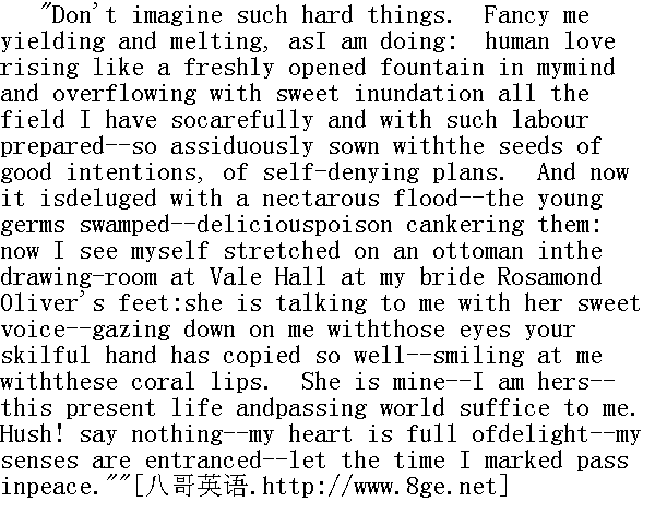别想这些严酷无情的东西了。要想象我让步了,被感化了,就像我正在做的那样。人类的爱像是我心田里新开辟的喷泉,不断上涨,甜蜜的洪水四溢,流淌到了我仔细而辛劳地开垦出来的田野--这里辛勤地播种着善意和自我克制的种子。现在这里泛滥着甜美的洪水--稚嫩的萌芽已被淹没--可口的毒药腐蚀着它们。此刻我看到自己躺在溪谷庄休息室的睡榻上,在我的新娘罗莎蒙德.奥利弗的脚跟前。她用那甜甜的嗓音同我在说话--用被你灵巧的手画得那么逼真的眼睛俯视着我--她那珊瑚色的嘴唇朝我微笑着--她是我的--我是她的--眼前的生活和过眼烟云般的世界对我已经足够了。嘘!别张嘴!一-我欣喜万分--我神魂颠倒-让我平静地度过我所规定的时间。" I humoured him: the watch ticked on: he breathed fast and low: Istood silent. Amidst this hush the quartet sped; he replaced thewatch, laid the picture down, rose, and stood on the hearth. 我满足了他。手表嘀嗒嘀嗒响着,他的呼吸时紧时慢,我默默地站着。在一片静谧中一刻钟过去了。他拿起手表,放下画,立起来,站在壁炉边。 "Now," said he, "that little space was given to delirium anddelusion. I rested my temples on the breast of temptation, and putmy neck voluntarily under her yoke of flowers. I tasted her cup.The pillow was burning: there is an asp in the garland: the winehas a bitter taste: her promises are hollow--her offers false: Isee and know all this."" 行啦,"他说,"在那一小段时间中我己沉溺于痴心妄想了。我把脑袋靠在诱惑的胸口,心甘情愿地把脖子伸向她花一般的枷锁。我尝了她的酒杯,枕头还燃着火,花环里有一条毒蛇,酒有苦味,她的允诺是空的--建议是假的。这一切我都明白。" I gazed at him in wonder. 我惊诧不己地瞪着他。 "It is strange," pursued he, "that while I love Rosamond Oliver sowildly--with all the intensity, indeed, of a first passion, theobject of which is exquisitely beautiful, graceful, fascinating--Iexperience at the same time a calm, unwarped consciousness that shewould not make me a good wife; that she is not the partner suited tome; that I should discover this within a year after marriage; andthat to twelve months' rapture would succeed a lifetime of regret.This I know."" 事情也怪,"他说下去,"我那么狂热地爱着罗莎蒙德.奥利弗--说真的怀着初恋的全部热情,而恋上的对象绝对漂亮、优雅、迷人--与此同时我又有一种宁静而不偏不倚的感悟,觉得她不会当个好妻子,不是适合我的伴侣,婚后一年之内我便会发现。十二个月销魂似的日子之后,接踵而来的是终身遗憾。这我知道。"