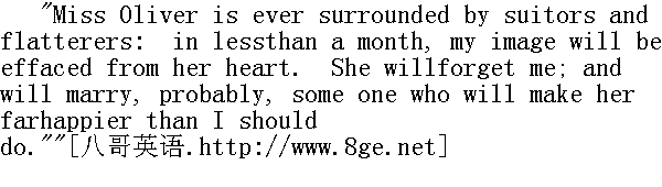 奥利弗小姐向来有一大群求婚者和献殷勤的人围着她转,不到一个月,我的形象会从她心坎里抹去,她会忘掉我,很可能会跟一个比我更能使她幸福的人结婚。" "You speak coolly enough; but you suffer in the conflict. You arewasting away."" 你说得倒够冷静的,不过你内心很矛盾,很痛苦。你日见消瘦。" "No. If I get a little thin, it is with anxiety about my prospects,yet unsettled--my departure, continually procrastinated. Only thismorning, I received intelligence that the successor, whose arrival Ihave been so long expecting, cannot be ready to replace me for threemonths to come yet; and perhaps the three months may extend to six."" 不,要是我有点儿瘦,那是我为悬而未决的前景担忧的缘故--我的离别日期一拖再拖。就是今大早上我还接到了消息,我一直盼着的后继者,三个月之内无法接替我,也许这三个月又会延长到六个月。" "You tremble and become flushed whenever Miss Oliver enters theschoolroom."" 无论什么时候,奥利弗小姐一走进教室你就颤抖起来、脸涨得通红。" Again the surprised expression crossed his face. He had notimagined that a woman would dare to speak so to a man. For me, Ifelt at home in this sort of discourse. I could never rest incommunication with strong, discreet, and refined minds, whether maleor female, till I had passed the outworks of conventional reserve,and crossed the threshold of confidence, and won a place by theirheart's very hearthstone. 他脸上再次浮起惊讶的表情。他想象不到一个女人居然敢于这么同一个男人说话。至于我,这-类交谈我非常习惯。我与很有头脑、言语谨慎、富有教养的人交际的时候,不管是男人还是女人,我非要绕过缄默的传统防卫工事,踏进奥秘的门槛,在心坎的火炉边上找到一个位置才肯罢休。