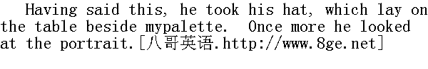 说完,他拿起放在桌上我画板旁的帽子,再一次看了看画像。 "She IS lovely," he murmured. "She is well named the Rose of theWorld, indeed!"" 她的确可爱,"他喃喃地说。"她不愧为世界上最好的玫瑰,真的。" "And may I not paint one like it for you?"" 我可不可以画一张像这样的给你呢?" "CUI BONO? No."" 干嘛?不必了。" He drew over the picture the sheet of thin paper on which I wasaccustomed to rest my hand in painting, to prevent the cardboardfrom being sullied. What he suddenly saw on this blank paper, itwas impossible for me to tell; but something had caught his eye. Hetook it up with a snatch; he looked at the edge; then shot a glanceat me, inexpressibly peculiar, and quite incomprehensible: a glancethat seemed to take and make note of every point in my shape, face,and dress; for it traversed all, quick, keen as lightning. His lipsparted, as if to speak: but he checked the coming sentence,whatever it was. 他拉过一张薄薄的纸盖在画上,这张纸是我平常作画时怕弄脏纸板常作为垫手用的。他突然在这张空白纸上究竟看到了什么,我无法判断。但某种东西引起了他的注意。他猛地拣起来,看了看纸边,随后瞟了我一眼,那目光奇怪得难以形容,而旦不可理解,似乎摄取并记下了我的体态、面容和服饰的每个细节。它一扫而过,犹如闪电般迅速和锐利。他张开嘴唇,似乎想说话,但把到了嘴边的什么话咽了下去。