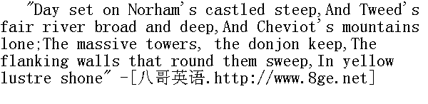残阳照着诺汉那城堡峭立的陡壁,美丽的特威德河又宽又深,契维奥特山孑然独立;气势雄伟的塔楼和城堡的主垒,两侧那绵延不绝的围墙,都在落日余辉中闪动着金光。 I soon forgot storm in music. 我立刻沉浸在音乐之中,忘掉了暴风雪。 I heard a noise: the wind, I thought, shook the door. No; it wasSt. John Rivers, who, lifting the latch, came in out of the frozenhurricane--the howling darkness--and stood before me: the cloakthat covered his tall figure all white as a glacier. I was almostin consternation, so little had I expected any guest from theblocked-up vale that night. 我听见了一声响动,心想一定是风摇动着门的声音。不,是圣.约翰.里弗斯先生,从天寒地冻的暴风雪中,从怒吼着的黑暗中走出来,拉开门栓,站有我面前。遮盖着他高高身躯的斗篷,像冰川一样一片雪白,我几乎有些惊慌了,在这样的夜晚我不曾料到会有穿过积雪封冻的山谷,前来造访的客人。 "Any ill news?" I demanded. "Has anything happened?"" 有什么坏消息吧?"我问。"出了什么事吗?"