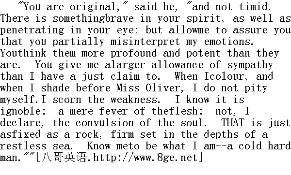 你确实见解独到,"他说,"胆子也不小。你的精神中有一种勇气,你的眼睛有一种穿透力,可是请允许我向你保证,你部份误解了我的情感。你把这些情感想象得比实际的要深沉,要强烈。你给了我甚于我正当要求的同情。我在奥利弗小姐面前脸红,颤抖时,我不是怜悯自己,而是蔑视我的弱点。我知道这并不光彩,它不过是肉体的狂热,我宣布,不是灵魂的抽搐。那灵魂坚加磐石,牢牢扎在骚动不安的大海深处。你知道我是怎么个人--一个冷酷无情的人。" I smiled incredulously. 我怀疑地笑了笑。 "You have taken my confidence by storm," he continued, "and now itis much at your service. I am simply, in my original state--stripped of that blood-bleached robe with which Christianity covershuman deformity--a cold, hard, ambitious man. Natural affectiononly, of all the sentiments, has permanent power over me. Reason,and not feeling, is my guide; my ambition is unlimited: my desireto rise higher, to do more than others, insatiable. I honourendurance, perseverance, industry, talent; because these are themeans by which men achieve great ends and mount to lofty eminence.I watch your career with interest, because I consider you a specimenof a diligent, orderly, energetic woman: not because I deeplycompassionate what you have gone through, or what you still suffer."" 你用突然袭击的办法掏出了我的心里话,"他继续说,"现在就听任你摆布了,剥去用基督教义来掩盖人性缺陷、漂净了血污的袍子,我本是个冷酷无情雄心勃勃的人。只有各种天生的情感会对我产生永久的力量。我的向导是理智而并非情感,我的雄心没有止境,我要比别人爬得高干得多的欲望永不能满足。我尊崇忍耐、坚持、勤勉和才能,因为这是人要干大事业,出大名的必要条件。我兴趣十足地观察了你的经历,因为我认为你是勤勤恳恳、有条有理、精力充沛的女人的典范,倒并不是因为我对你所经历的或正在受的苦深表同情。" "You would describe yourself as a mere pagan philosopher," I said." 你会把自己描述成不过是位异教徒哲学家的。"我说。 "No. There is this difference between me and deistic philosophers:I believe; and I believe the Gospel. You missed your epithet. I amnot a pagan, but a Christian philosopher--a follower of the sect ofJesus. As His disciple I adopt His pure, His merciful, Hisbenignant doctrines. I advocate them: I am sworn to spread them.Won in youth to religion, she has cultivated my original qualitiesthus:- From the minute germ, natural affection, she has developedthe overshadowing tree, philanthropy. From the wild stringy root ofhuman uprightness, she has reared a due sense of the Divine justice.Of the ambition to win power and renown for my wretched self, shehas formed the ambition to spread my Master's kingdom; to achievevictories for the standard of the cross. So much has religion donefor me; turning the original materials to the best account; pruningand training nature. But she could not eradicate nature: nor willit be eradicated 'till this mortal shall put on immortality.'"" 不,我与自然神论的哲学家之间是有区别的:我有信仰,我信奉福音。你用错了修饰语。我不是异教徒哲学家,正是基督教哲学家--一个耶稣教派的信徒,作为他的信徒,我信仰他纯洁、宽厚、仁慈的教义。我主张这样的教义、发誓要为之传播,我年轻时就信仰宗教,于是宗教培养了我最初的品格--它已从小小的幼芽,自然的情感,长成浓荫蔽日的大树,变成了慈善主义,从人类真诚品质的粗糙野生的根子上,相应长出了神圣的公正感。把我为可怜的自我谋求权力和名声的雄心,变成扩大主的天地、为十字架旗帜获得胜利的大志。宗教已为我做了很多,把原始的天性变成最好的品质、修剪和培育了天性。但是无法根除天性,天性也不可能根除,直到"这必死的变成不死的'时候。"