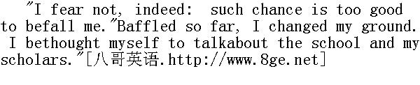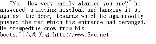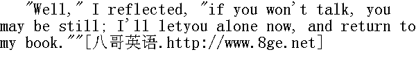 他女儿的,我想。" "It is like her: she is so good-natured."" 是像她建议的,她心地善良。" "Yes."" 是呀。" Again came the blank of a pause: the clock struck eight strokes.It aroused him; he uncrossed his legs, sat erect, turned to me. 谈话停顿了下来,再次出现了空隙。时钟敲了八下。钟声把他惊醒了,他分开交叉的腿,站直了身子,转向我。 "Leave your book a moment, and come a little nearer the fire," hesaid." 把你的书放-会儿吧,过来靠近点火炉"他说。