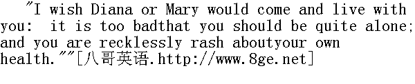 但愿黛安娜或玛丽会来跟你住在一起,你那么孤零零一个人,实在太糟糕了,而你对自己的健康又那么草率。" "Not at all," said he: "I care for myself when necessary. I amwell now. What do you see amiss in me?""- 点也没有,"他说,"必要时我会照顾自己的,我现在很好,你看见我什么地方不好啦?" This was said with a careless, abstracted indifference, which showedthat my solicitude was, at least in his opinion, wholly superfluous.I was silenced. 他说这话的时候心不在焉,神情漠然。表明我的关切,至少在他看来是多余的。我闭上了嘴。 He still slowly moved his finger over his upper lip, and still hiseye dwelt dreamily on the glowing grate; thinking it urgent to saysomething, I asked him presently if he felt any cold draught fromthe door, which was behind him. 他依然慢悠悠地把手指移到上嘴唇,依然那么睡眼朦胧地看着闪烁的炉格,像是有什么要紧的事儿要说。我立刻问他是不是感到有一阵冷风从他背后的门吹来。 "No, no!" he responded shortly and somewhat testily. 没有,没有,"他有些恼火,回答得很简捷,