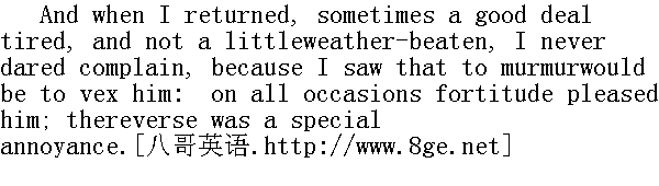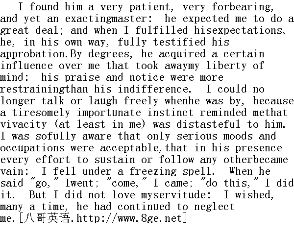 我发现他是位耐心、克制而又很严格的老师。他期望我做得很多,而一旦我满足了他的期望,他又会以自己的方式表示赞许。渐渐地他产生了某种左右我的力量,使我的头脑失去了自由。他的赞扬和注意比他的冷淡更有抑制作用。只要他在,我就再也不能谈笑自如了,因为一种纠缠不休的直觉,提醒我他讨厌轻松活泼(至少表现在我身上时)。我完全意识到只有态度严肃,干着一本正经的事儿才合他的心意,因此凡他在场的时候,就不可能有别的想头了。我觉得自己被置于一种使人结冻的魔力之下。他说"去",我就去,他说"来",我就来;他说"干这个",我就去干。但是我不喜欢受奴役,很多次都希望他像以前那样忽视我。 One evening when, at bedtime, his sisters and I stood round him,bidding him good-night, he kissed each of them, as was his custom;and, as was equally his custom, he gave me his hand. Diana, whochanced to be in a frolicsome humour (SHE was not painfullycontrolled by his will; for hers, in another way, was as strong),exclaimed - 一天夜里,到了就寝时间,他的妹妹和我都围他而立,同他说声晚安。他照例吻了吻两个妹妹,又照例把手伸给我。黛安娜正好在开玩笑的兴头上(她并没有痛苦地被他的意志控制着,因为从另一个意义上说她的意志力也很强),便大叫道。