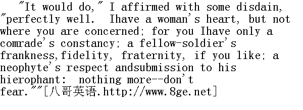 这行",我有些不屑地肯定说,"完全行。我有一颗女人的心,但这颗心与你说的无关。对你,我只抱着同伴的坚贞,兄弟战士的坦率、忠诚和友情,如果还有别的,那就是新教士对圣师的尊敬和服从。没有别的了--请放心。"