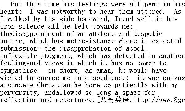 但这时候他把自己的感情全都闷在心里。我不配听它渲泄。我跟着他往家走的时候,从他铁板一样的沉默中,我清楚地知道他对我的态度。那是一种严厉、专制的个性,在预料对方能俯首贴耳的情形下,遭到了反抗--对一种冷静和不可改变的裁决表示了非难之后,以及在另一个人身上发现了自己无力打动的情感与观点之后所感到的失望。总之,作为一个男人,他本希望逼迫我就范。而只是因为他是一个虔诚的基督教徒,才这么耐心地忍住了我的执拗,给我那么长时间思考和忏悔。
