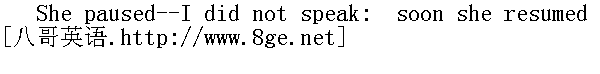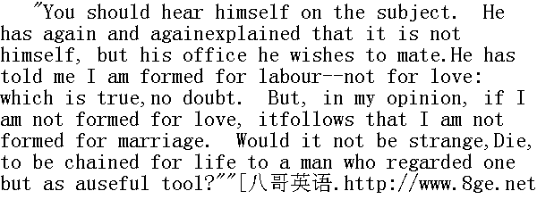 你应该听听他自己谈谈对这个问题的看法。他口口声声解释说他要结婚,不是为了他自己,而是为了他的圣职。他还告诉我,我生来就是为了劳作,而不是为了爱情。无疑这话也有道理。但在我看来,如果我生来不是为了爱情,那么随之而来,也生来不是为了婚配。这岂不是咄咄怪事,黛,一生跟一个男人拴在一起,而他只把我当作一样有用的工具?" "Insupportable--unnatural--out of the question!"" 不能容忍--不通人情--办不到的!" "And then," I continued, "though I have only sisterly affection forhim now, yet, if forced to be his wife, I can imagine thepossibility of conceiving an inevitable, strange, torturing kind oflove for him, because he is so talented; and there is often acertain heroic grandeur in his look, manner, and conversation. Inthat case, my lot would become unspeakably wretched. He would notwant me to love him; and if I showed the feeling, he would make mesensible that it was a superfluity, unrequired by him, unbecoming inme. I know he would."" 还有,"我继续说,"虽然我现在对他有兄妹之情,但要是我被迫做了他妻子,我能想象,我对他的爱很可能会无可奈何,奇怪反常,备受折磨。因为他那么有才能,神态、举动和谈吐无不诱出一种英雄气概。那样,我的命运就会悲惨得难以形容。他会不要我爱他,要是我依然有所表露,他会让我感到,那是多余的,他既不需要,对我也不合适。我知道他会这样。" "And yet St. John is a good man," said Diana." 而圣.约翰是个好人,"黛安娜说。 "He is a good and a great man; but he forgets, pitilessly, thefeelings and claims of little people, in pursuing his own largeviews. It is better, therefore, for the insignificant to keep outof his way, lest, in his progress, he should trample them down.Here he comes! I will leave you, Diana." And I hastened upstairsas I saw him entering the garden." 他是一个好人,也是个伟人。可惜他在追求大目标时,忘掉了小人物的情感和要求。因此,微不足道的人还是离他远一点好,免得他在前进时把他们踩倒了。他来了,我得走了,黛安娜。"我见他进了园子,便匆匆上楼去了。