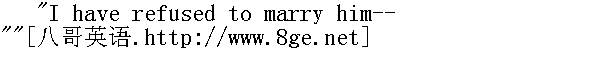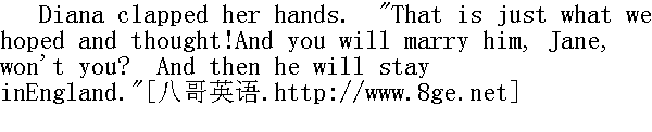 黛安娜拍手叫好。"这正是我们的愿望和想法呢!你会嫁给他的,简,是吗?那样他就会留在英国了。" "Far from that, Diana; his sole idea in proposing to me is toprocure a fitting fellow-labourer in his Indian toils."" 他才不会呢,黛安娜。他向我求婚只有一个意思,那就是为他在印度的苦役找个合适的伙伴。" "What! He wishes you to go to India?"" 什么!他希望你去印度?" "Yes."" 不错。" "Madness!" she exclaimed. "You would not live three months there, Iam certain. You never shall go: you have not consented, have you,Jane?"" 简直疯了!"她嚷到。"我敢肯定,你在那里住不满三十月。你决不能去,你没有同意,是吧,简?"