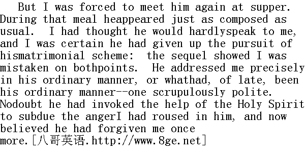 但是吃晚饭时我不得不再次与他相遇。用餐时他完全像平常那样显得很平静,我本以为他不会同我说话了,而且确信他已经放弃了自己的婚姻计划,但后来的情况表明,在这两点上我都错了。他完全以平常的态度,或者说最近已习以为常的态度同我说话。无疑他求助于圣灵来克制我在他心里所激起的愤怒,现在他相信已再次宽恕了我。 For the evening reading before prayers, he selected the twenty-firstchapter of Revelation. It was at all times pleasant to listen whilefrom his lips fell the words of the Bible: never did his fine voicesound at once so sweet and full--never did his manner become soimpressive in its noble simplicity, as when he delivered the oraclesof God: and to-night that voice took a more solemn tone--thatmanner a more thrilling meaning--as he sat in the midst of hishousehold circle (the May moon shining in through the uncurtainedwindow, and rendering almost unnecessary the light of the candle onthe table): as he sat there, bending over the great old Bible, anddescribed from its page the vision of the new heaven and the newearth--told how God would come to dwell with men, how He would wipeaway all tears from their eyes, and promised that there should be nomore death, neither sorrow nor crying, nor any more pain, becausethe former things were passed away. 祷告前的晚读,他选了《启示录》的第二十一章。倾听《圣经》中的话从他嘴里吐出来始终是一种享受。他在发表上帝的圣谕时,他优美的嗓子是最洪亮又最动听的,他的态度之高尚纯朴也最令人难忘。而今天晚上,他的语调更加严肃--他的态度更富有令人震颤的含义--他坐在围成一圈的家人中间(五月的月亮透过没有拉上窗帘的窗子,泻进室内,使桌上的烛光显得几乎是多余的了)。他坐在那里,低头看着伟大而古老的圣经,描绘着书页中的新天堂和新世界的幻境--告诉大家上帝如何会来到世间与人同住,如何会抹去人们的眼泪,并允诺不会再有死亡,也不会有忧愁或者哭泣,不会有痛苦,因为这些往事都已一去不复回了。 The succeeding words thrilled me strangely as he spoke them:especially as I felt, by the slight, indescribable alteration insound, that in uttering them, his eye had turned on me. 接着的一番话,他讲得让我出奇地激动不已,尤其是从他声音的难以描述的细小变化中,我感觉到,他在说这些话的时候,目光已经转向了我。 "He that overcometh shall inherit all things; and I will be his God,and he shall be my son. But," was slowly, distinctly read, "thefearful, the unbelieving, &c., shall have their part in the lakewhich burneth with fire and brimstone, which is the second death."" 得胜的,必承受这些为业,我要作他的上帝,他要作我的儿子。"这段话读得又慢又清楚,"唯有胆怯的,不信的……他们的份,就在烧着硫磺的火湖里,这是第二次的死。"