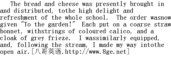 面包和乳酪立刻端了进来,分发给大家,全校都欢欣鼓舞,精神振奋。这时来了命令,"到花园里去!"每个人都戴上一个粗糙的草帽,帽子上拴着用染色白布做成的带子,同时还披上了黑粗绒料子的斗篷。我也是一付同样的装束,跟着人流,迈步走向户外。 The garden was a wide inclosure, surrounded with walls so high as toexclude every glimpse of prospect; a covered verandah ran down oneside, and broad walks bordered a middle space divided into scores oflittle beds: these beds were assigned as gardens for the pupils tocultivate, and each bed had an owner. When full of flowers theywould doubtless look pretty; but now, at the latter end of January,all was wintry blight and brown decay. I shuddered as I stood andlooked round me: it was an inclement day for outdoor exercise; notpositively rainy, but darkened by a drizzling yellow fog; all underfoot was still soaking wet with the floods of yesterday. Thestronger among the girls ran about and engaged in active games, butsundry pale and thin ones herded together for shelter and warmth inthe verandah; and amongst these, as the dense mist penetrated totheir shivering frames, I heard frequently the sound of a hollowcough. 这花园是一大片圈起来的场地,四周围墙高耸,看不到外面的景色。一边有-条带顶的回廓,还有些宽阔的走道,与中间的一块地相接,这块地被分割成几十个小小的苗圃,算是花园,分配给学生们培植花草,每个苗圃都有一个主人,鲜花怒放时节,这些苗圃一定十分标致,但眼下一月将尽,一片冬日枯黄凋零的景象。我站在那里,环顾四周,不觉打了个寒噤,这天的户外活动,天气恶劣,其实并没有下雨,但浙浙沥沥的黄色雾霭,使天色变得灰暗;脚下因为昨天的洪水依然水湿,身体比较健壮的几位姑娘窜来奔去,异常活跃;但所有苍白瘦弱的姑娘都挤在走廊上躲雨和取暖。浓雾渗透进了她们颤抖着的躯体,我不时听见一声声空咳。 As yet I had spoken to no one, nor did anybody seem to take noticeof me; I stood lonely enough: but to that feeling of isolation Iwas accustomed; it did not oppress me much. I leant against apillar of the verandah, drew my grey mantle close about me, and,trying to forget the cold which nipped me without, and theunsatisfied hunger which gnawed me within, delivered myself up tothe employment of watching and thinking. My reflections were tooundefined and fragmentary to merit record: I hardly yet knew whereI was; Gateshead and my past life seemed floated away to animmeasurable distance; the present was vague and strange, and of thefuture I could form no conjecture. I looked round the convent-likegarden, and then up at the house--a large building, half of whichseemed grey and old, the other half quite new. The new part,containing the schoolroom and dormitory, was lit by mullioned andlatticed windows, which gave it a church-like aspect; a stone tabletover the door bore this inscription:- 我没有同人说过话,也似乎没有人注意到我。我孤零零地站着,但己经习惯于那种孤独感,并不觉得十分压抑,我倚在游廊的柱子上,将灰色的斗篷拉得紧紧地裹着自己,竭力忘却身外刺骨的严寒,忘却肚子里折磨着我的饥馑,全身心去观察和思考。我的思索含含糊糊,零零碎碎,不值得落笔。我几乎不知道自己身居何处。盖茨黑德和往昔的生活似乎已经流逝,与现时现地已有天壤之隔。现实既模糊又离奇,而未来又不是我所能想象。我朝四周看了看修道院一般的花园,又抬头看了看建筑。这是幢大楼,一半似乎灰暗古旧,另一半却很新。新的一半里安排了教室和寝室,直棂格子窗里灯火通明,颇有教堂气派。门上有一块石头牌子,上面刻着这样的文字: