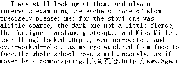 我仍旧打量着她们,间或也仔细审视了一下教师--确切地说没有一个使人赏心悦目。胖胖的一位有些粗俗;黑黑的那个很凶;那位外国人苛刻而怪僻;而米勒小姐呢,真可怜,脸色发紫,一付饱经风霜、劳累过度的样子,我的目光正从一张张脸上飘过时,全校学生仿佛被同一个弹簧带动起来似的,都同时起立了。 What was the matter? I had heard no order given: I was puzzled.Ere I had gathered my wits, the classes were again seated: but asall eyes were now turned to one point, mine followed the generaldirection, and encountered the personage who had received me lastnight. She stood at the bottom of the long room, on the hearth; forthere was a fire at each end; she surveyed the two rows of girlssilently and gravely. Miss Miller approaching, seemed to ask her aquestion, and having received her answer, went back to her place,and said aloud - 这是怎回事,并没有听到谁下过命令,真把人搞糊涂了。我还没有定下神来,各个班级又再次坐下。不过所有的眼睛都转向了一点,我的目光也跟踪大伙所注意的方向,看到了第一天晚上接待我的人,她站在长房子顶端的壁炉边上,房子的两头都生了火,她一声不吭神情严肃地审视着两排姑娘。米勒小姐走近她,好像问了个问题,得到了回答后,又回到原来的地方,人声说道: "Monitor of the first class, fetch the globes!"" 第一班班长,去把地球仪拿来!" While the direction was being executed, the lady consulted movedslowly up the room. I suppose I have a considerable organ ofveneration, for I retain yet the sense of admiring awe with which myeyes traced her steps. Seen now, in broad daylight, she lookedtall, fair, and shapely; brown eyes with a benignant light in theiririds, and a fine pencilling of long lashes round, relieved thewhiteness of her large front; on each of her temples her hair, of avery dark brown, was clustered in round curls, according to thefashion of those times, when neither smooth bands nor long ringletswere in vogue; her dress, also in the mode of the day, was of purplecloth, relieved by a sort of Spanish trimming of black velvet; agold watch (watches were not so common then as now) shone at hergirdle. Let the reader add, to complete the picture, refinedfeatures; a complexion, if pale, clear; and a stately air andcarriage, and he will have, at least, as clearly as words can giveit, a correct idea of the exterior of Miss Temple--Maria Temple, asI afterwards saw the name written in a prayer-book intrusted to meto carry to church. 这个指示正在执行的时候,那位被请示过的小姐馒慢地从房间的一头走过来。我猜想自己专司敬重的器言特别发达,因为我至今仍保持着一种敬畏之情,当时带着这种心情我的目光尾随着她的脚步。这会儿大白天,她看上去高挑个子,皮肤白皙,身材匀称,棕色的眸子透出慈祥的目光、细长似画的睫毛,衬托出了她又白又大的前额,两鬓的头发呈暗棕色,按一流行式洋、束成圆圆的卷发,当时光滑的发辫和长长的卷发,并没有成为时尚。她的服装,也很时髦,紫颜色布料,用一种黑丝绒西班牙饰边加以烘托。一只金表(当时手表不像如今这么普通)在她腰带上闪光。要使这幅画像更加完整,读者们还尽可补充:她面容清丽,肤色苍白却明澈,仪态端庄。这样至少有文字所能清楚表达的范围内,可以得出了坦普尔小姐外貌的正确印象了。也就是玛丽亚.坦普尔,这个名字,后来我是在让我送到教党去的祈祷书上看到的。 The superintendent of Lowood (for such was this lady) having takenher seat before a pair of globes placed on one of the tables,summoned the first class round her, and commenced giving a lesson ongeography; the lower classes were called by the teachers:repetitions in history, grammar, &c., went on for an hour; writingand arithmetic succeeded, and music lessons were given by MissTemple to some of the elder girls. The duration of each lesson wasmeasured by the clock, which at last struck twelve. Thesuperintendent rose - 这位罗沃德学校的校长(这就是这个女士的职务)在放在一张桌上的两个地球仪前面坐了下来,把第一班的人叫到她周围,开始上起地理课来。低班学生被其他教师叫走,反复上历史呀,语法呀等课程,上了一个小时。接着是写作和数学,坦普尔小姐还给大一点的姑娘教了音乐,每堂课是以钟点来计算的,那钟终于敲了十二下,校长站了起来。